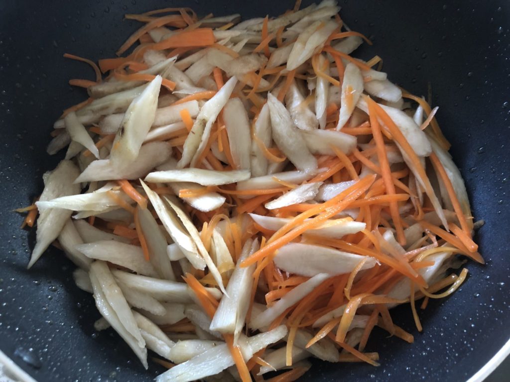 2.熱したフライパンにごま油をひき、ごぼうと人参を投入。しんなりするまで炒める。