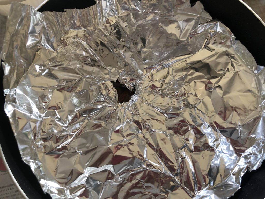 4.落し蓋をしてさらに鍋の蓋を。落し蓋がない場合は、アルミ箔などで代用できる。