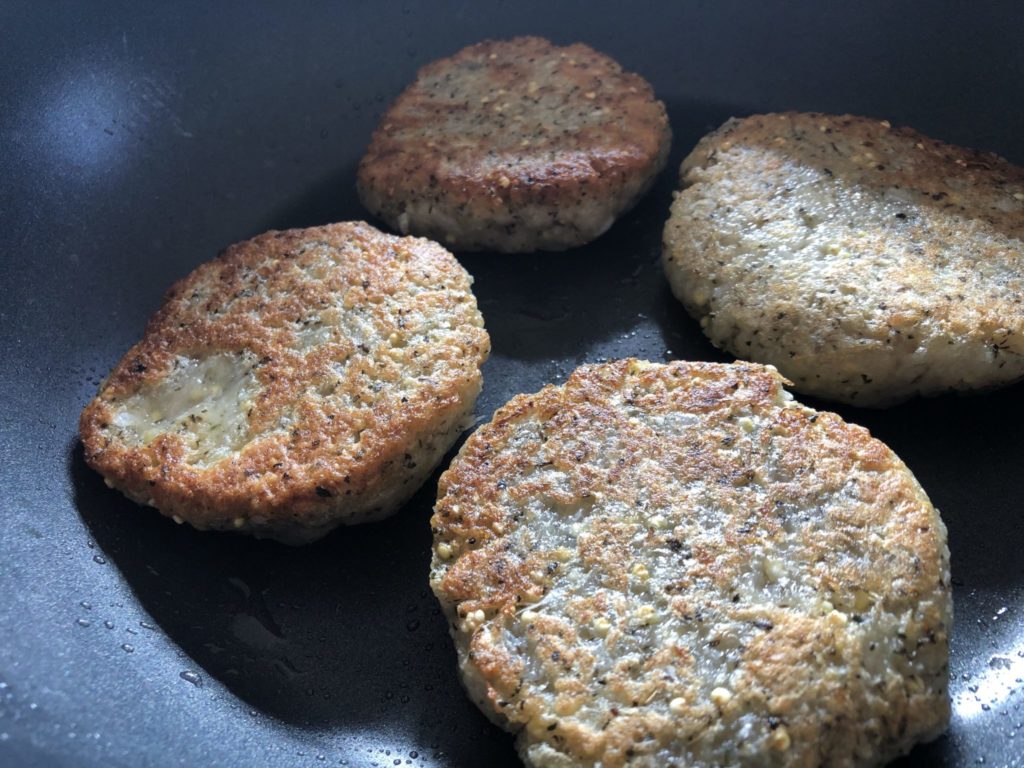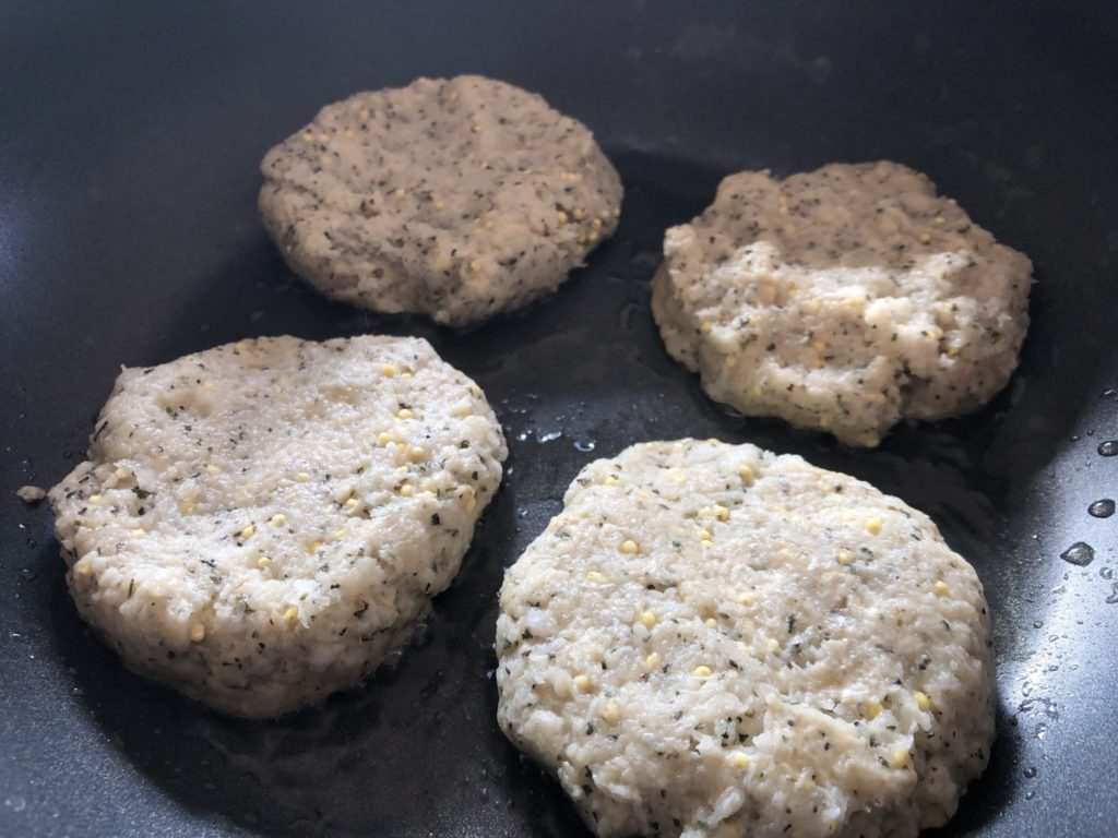3.フライパンに油をひき、適当な大きさにして生地を並べ、蓋をして中火で焼く。
