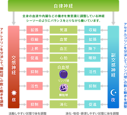 想像できたら、図の交感神経と副交感神経のところを見て、答え合わせをしてみてください。ご想像と合っていましたか?