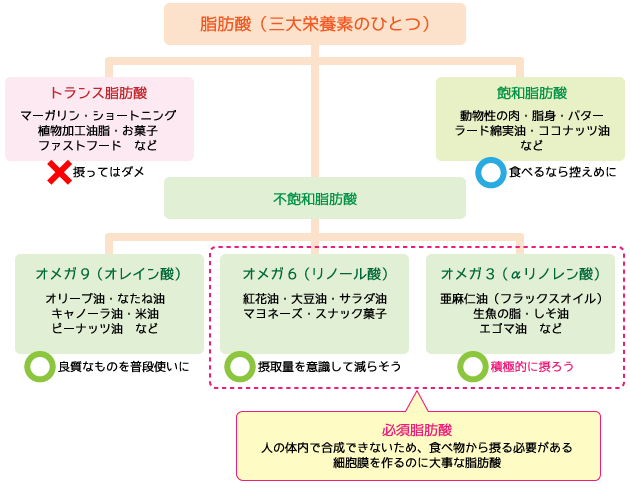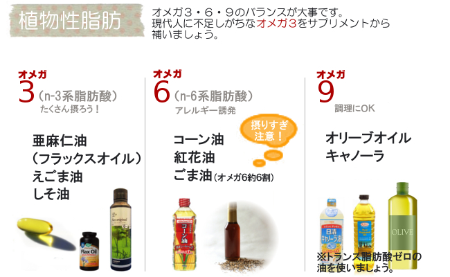 まずは植物性を選ぶ。中でもオメガ3(EPAやDHA)をふやす。加熱調理ならごま油。アロマオイルは精油じゃない。マーガリンやショートニングは絶対ダメ(お菓子やパンには大抵入っていますよ)。