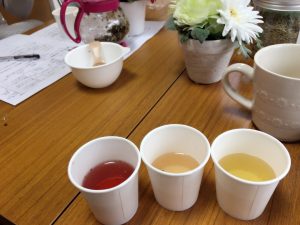 せっかく複数人数いるのですから、全員分を試飲しましょう。まずはハーブティーを淹れてみると、三者三様に綺麗なティーの色^^